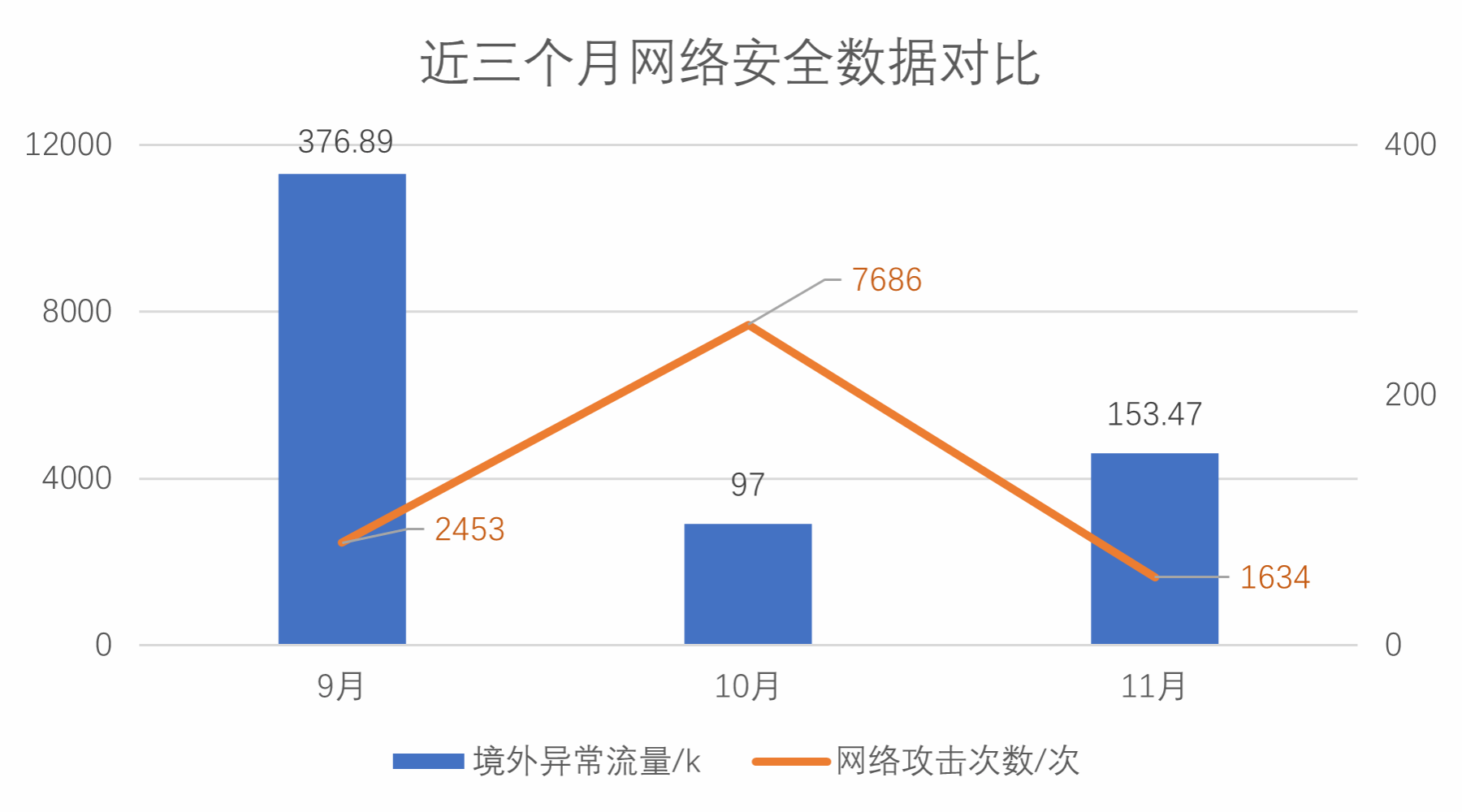 11月,学校整体网络运行态势平稳。与上月相比,本月境外异常流量有所增加,总攻击次数有所减少。校内业务系统漏洞检测数量显著下降。