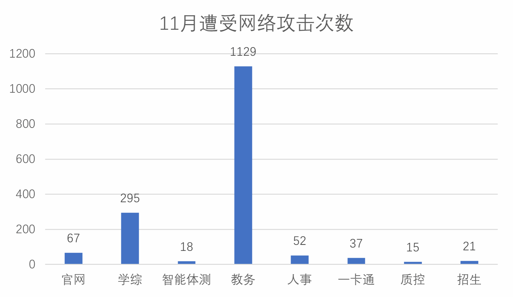 根据出口防火墙拦截阻断记录,本月针对业务系统的校外“高风险”网络攻击共计1634次,其中主要针对教务系统1129次。